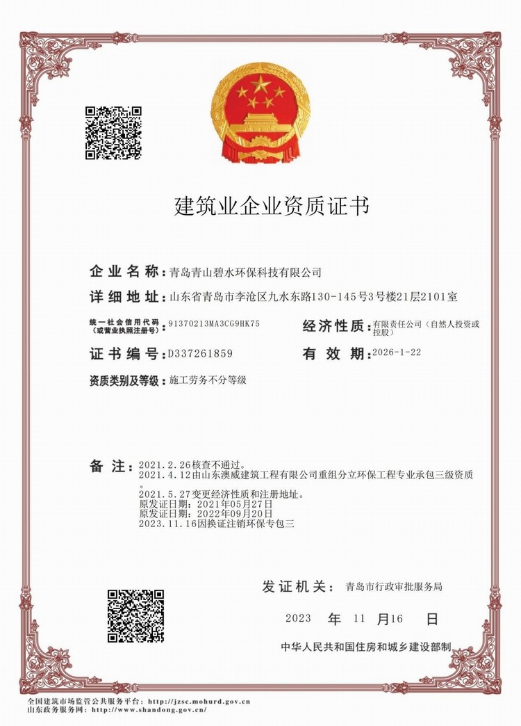 環(huán)保工程專業(yè)承包貳級及施工勞務資質證書